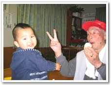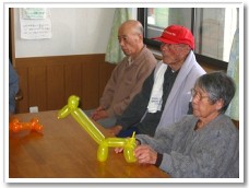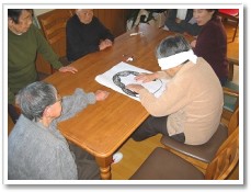 ミカンを食べているとカズ君がやってきて「ちょーだい!!」とパーを出し、利用者さんは、めげずに”じゃんけんだ”とチョキを出す。結局ミカンは、丸のまんま利用者さんの口の中(笑) |