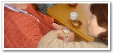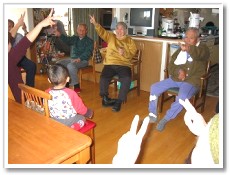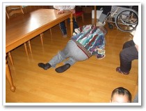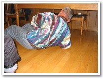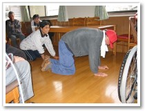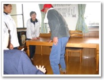 利用者さんは、体になんらかの障害をもっている方が大半です。最近、キュっと冷え込んできたためか「よく転んでなぁ〜」といわれる方が増えました。そこでっ!!「よしっ、転んだときのために・・・」とわざと転んで立ち上がりの練習開始。床に寝転んだ瞬間、方向感覚が全く無くなってしまう人もあれば、「あれまあ簡単に立ち上がるねぇ」と感心するくらい身軽?慣れてる?人もいました。 |