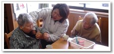 ナイス・デイに到着後、体温測定や血圧測定を行います。血圧測定のときには「あれ、いつもより脈が多いね〜」「綺麗な人に手ぇ握ってもらったからだわ(笑)」など笑い声が聞こえます。