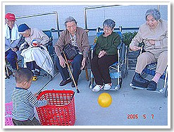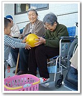 突然のことに利用者さん達は大笑い。でも、「小さな子に渡されるとやらずにはおれんわな〜」とみんな必死に洗濯籠めがけて投げ続けていました。お疲れ様です(笑) |
