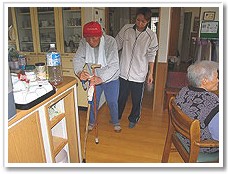 115歳を目標(今年で目標−25歳)に「まだまだ死ねん!なんか儲かることをせな。」と、毎日を意欲的に生きている利用者さん。確かにボーッとしていることもあるけれど、「若い者には負けれんでなぁ」と頑張っています。いくらヨロヨロしても、階段の手すりをしっかり握りながら2階への昇り降りもしています。 |