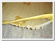 やってしまいました。去年購入されたばかりの柄入りのゴザ。端っこに自分の“あんよ(足)”がはまってる。