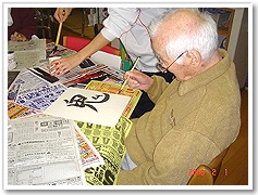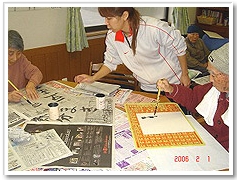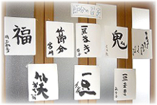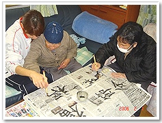節分の日を前に、習字のお手前を拝見しようと、一人ひとりが筆をとりました。