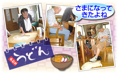 腰のあるうどんが出来上がるように、いつものうっぷんを晴らすつもりで一生懸命踏むんだよ〜 生地をのばす手つきもさすがじゃないですか? |