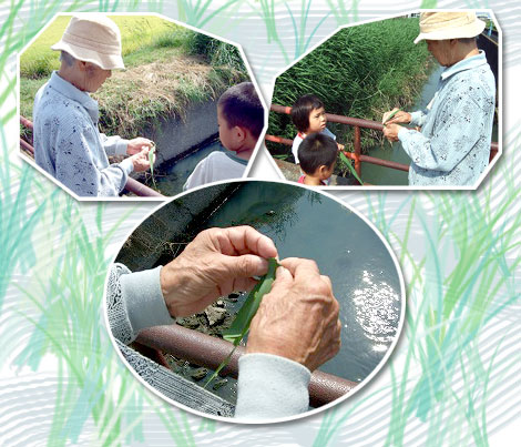日曜日、近くの用水まで散歩に出かけると、子供たちもついてきました。そこに生えている雑草をもってきて、「お舟作って」と言ってきました。