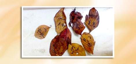 ※おまけ・・事務所の机の上にこんな葉っぱがのっていました。利用者さん達と近くの神社に散歩に出掛けた際、落ち葉をひろい集めて帰ってきた様子。顔の絵を書いた落ち葉は子供用自転車のカゴにも沢山入っていましたよ。 |