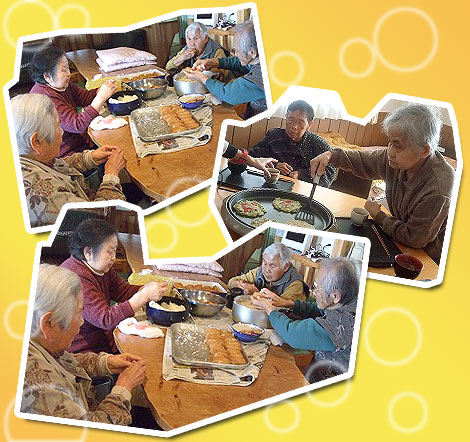 普段は近くにある物を「膝が痛いでそれとって。」とスタッフに頼むYさん。 でも、テーブル上でお好み焼きをする時はササットと立ちいつになく真剣にホットプレートを覗き込み、「今!」のタイミングでひっくり返します。