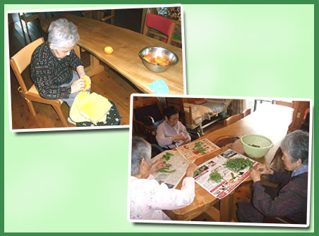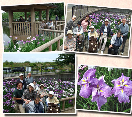 「今日雨降ってないよね〜。外の空気吸いに行こっか!!」デイとホーム合同でお出掛けです。「きれいだねー。」「アタシこの色好き。」と皆花のような笑顔を見せてくれました。 |