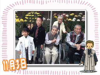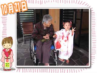 『あれっ!?おばあさんじゃない?』との声に振りむけば、息子さん一家が七五三参りの様子。一緒に出掛けることは難しいと思って諦めていたらしく、『記念写真が撮れるね。』と孫さんと撮影。