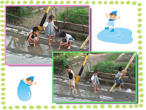 チビキッズ達が静かに遊んでいるなぁ・・と思った瞬間、 外から「あの子達汚ったねぇ〜。」という声が聞こえました。 見ると小学生が自転車で通り過ぎるところ。 チビキッズが道路の水たまりに入って、仲良くピチャピチャと遊んでいるではないですか。