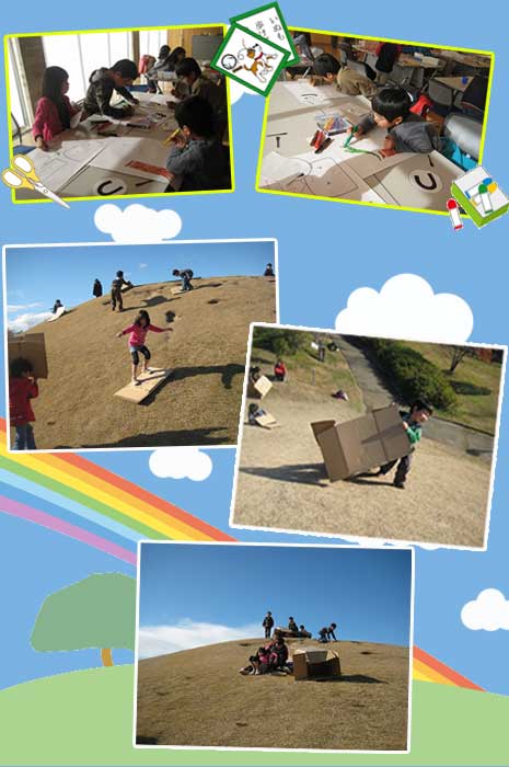 市の発行する毎月の広報を見ていたら『巨大カルタを作ろう』というイベントがありました。 「最近おお出掛けしてないなぁ」と、早速、年内最後のお出掛けイベントを計画♪ カルタ作りは、自分で好きな字を選んでその字にちなんだ絵を描きました。 その後が大変。『遊びのメインはこっちだったか!』って感じで、持参してきたダンボール片手に巨大な芝生の山を“キャーキャー”“ワーワー”と大興奮で滑りつくすキッズ達…。「寒くないんかなぁ〜」なんて後ろで縮こまって見ていたスタッフもいつの間にやらキッズ達と一緒に楽しんじゃいました。 キッズ達が作った巨大カルタは、今頃、七宝焼アートビレッジに展示されていることでしょう。