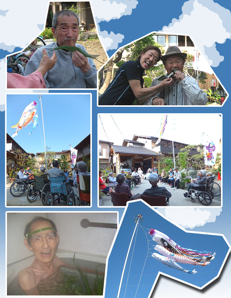 当日、天気に恵まれたので全員に声を掛け、外で子供の日にちなんだ歌の大合唱が始まった。すっごい楽しかった。ついで(いやいやこっちが主?)に外で食べるかしわ餅&ちまきも格別に美味い。お風呂はもちろん菖蒲の湯でっせ〜。 |