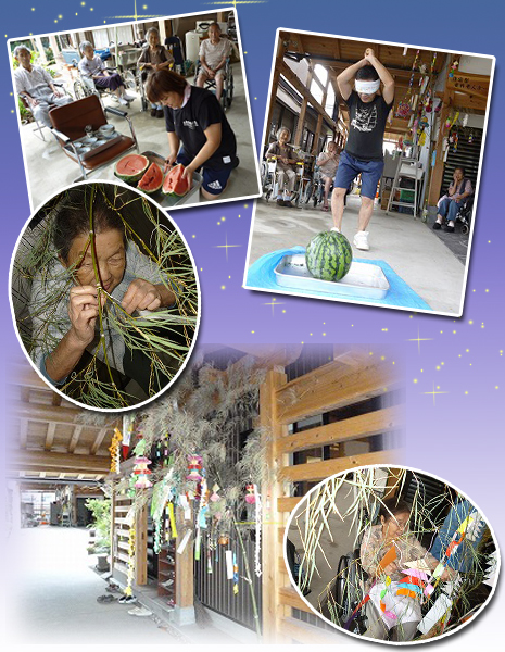 短冊片手に「お願いごと書いてくださーい」とスタッフが利用者さんやスタッフ皆に配ります。「この歳になって、願い事なんて無いわ〜。」な〜んて言いいながら、話をしていると(やっぱり♪)願い事が出てきました。いくつになってお願いは聞いて欲しいもの。『もっとシャンシャンと歩きたい』『おいしいもの食べたい』等など。 今年は面会に来たご家族にもお願いしました。 七夕の日、デイ・愛宕の家・ホーム合同で七夕会を行いました。男性スタッフが皆さんの思いを胸にお供えのスイカ割り。季節の行事は“楽しい+懐かしい”反応あり! 今年も半分過ぎました。残りの行事も楽しんで参加してもらえるものにしていきます。