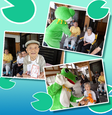 津島市から連絡が入り「津島かるたが完成した」とのこと。 とってもかわいいカエルさんが津島カルタのプレゼントを持って来てくれました。 皆、津島カルタに興味津々。カルタを見て、『これ、わしの家の近くだ!!』と会話にも華やかさが見られました。