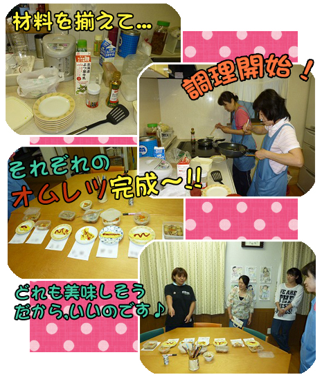 先月の通信でお伝えした訪問介護の“調理” 社内実践研修で、オムレツの調理実習開始。まずは材料の確認。油を使うのか、マーガリンを使うのか…。味付けは塩コショウなのかしょうゆを加えるのか・・・。それぞれ、少しずつ調味料や材料が違いました。完成品の見た目の違いも大いに確認できました。 結果『十人十色で良しじゃない?せっかく色んな人が作るのに、同じ味じゃつまらない。本人の好みから外れなければそれぞれの味でいいのでは。』 但し、食べる方の体調を考え、その日その日の配慮は絶対です。