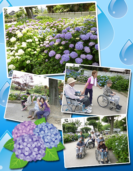 『晴れた!今日しかないぞ!』とお出掛けの号令がかかりました。行先は稲沢のアジサイ寺。毎年恒例のお出掛け場所。車イス使用の方が増えていますが、みんなで出掛けたいんです!到着すると満開で何種類もあるアジサイが目を楽しませてくれました。広い敷地内を移動するのは大変です。アジサイに目を奪われた利用者さんが転ばないか見守り、車いすを押し…。外出にはいろんな危険があります。でも、やっぱり意味がある。利用者さんの顔を見れば一目瞭然。笑顔です♪♪