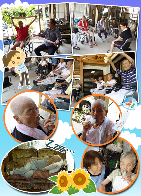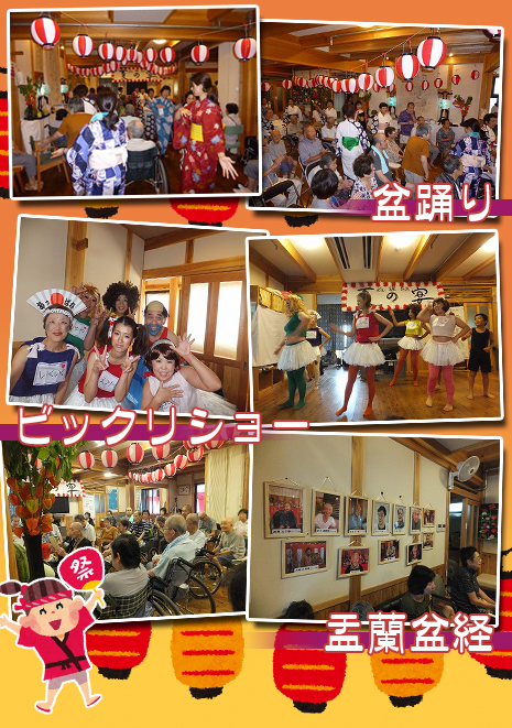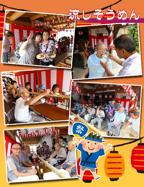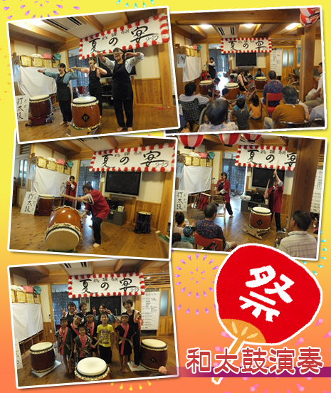 盆踊り・手作り御馳走&流しそうめん・輪投げ&掴み取ゲーム・和太鼓演奏・ビックリショー等々、とにかく一日が走馬灯のように終わった。日々の感謝の気持ちを込めて開催する夏の宴です。利用者さんには「こんな楽しいことがあるなんて・・」と涙々の方もあり、家族さんとも一緒に時間を過ごせ、いつもなら食べないそうめんを美味しそうに食べる方あり、ボランティアさんの協力を得て盛り上がり、ご近所さん・各事業所の方にも楽しく賑やかな時間を過ごしていただけたのではないでしょうか。 |