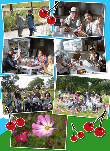 お手製の行楽弁当を準備して、遠足に出掛けました。木曽三川公園に到着し、満開のコスモスを見、行楽弁当を食す。天気にも恵まれ最高の遠足になりました。帰ってきた皆さんに「どうだったぁ?」と留守番スタッフが聞く。皆が皆「お弁当美味しかったよぉ〜」と。花より団子か・・・なんて思いながらも、皆が笑顔だったので良しとしますかっ♪♪