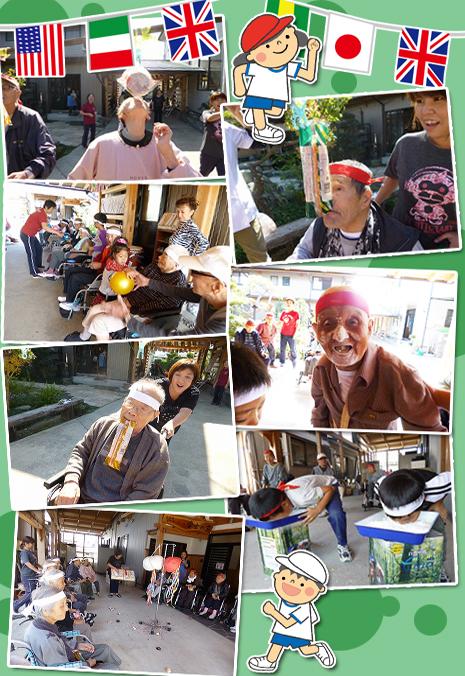 軽快なBGMに誘われたか、2日間に渡り開催した大運動会には、ほぼ全員が参加した。皆、頭にハチマキをキュ〜ッと締め、やる気満々。 2日目は土曜日という事もあり家族やキッズ達も参加。大いに盛り上がりました。パン食い競争では、走れないはずの人がホントに走ってしまうほどの白熱ぶり。ボール渡しでは、「白の勝ち〜」と判定が下ると、「もう一回!!」とリベンジコールもあったほど(笑)企画係は「どんな種目が盛り上がるかなぁ」と散々悩んでいましたが、ホッとするほどの盛り上がり。ケガも無く運動会を閉会することができました。そして、翌日の午前、来年の大運動会に向けて、機能訓練・筋力低下防止の運動が繰り広げられます。