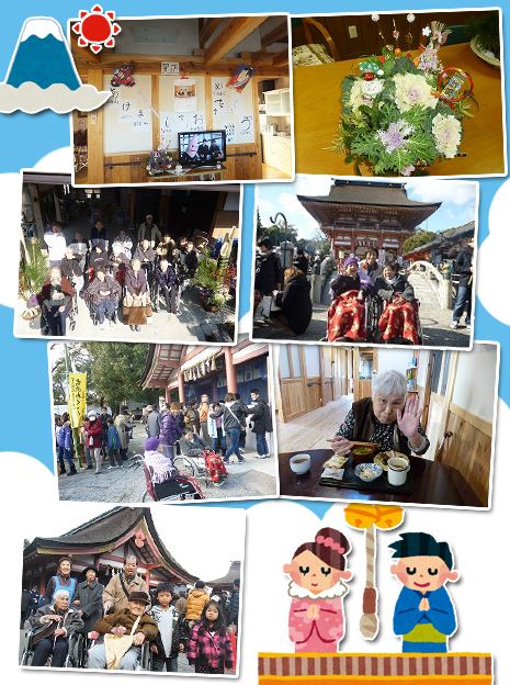 年が明け、1月1日。朝、元気そうな顔めがけて「明けましておめでとうございま〜す」「おう、おめでとう」と、お決まりのやり取りをしながら、元旦の朝食はお雑煮とおせち。 2日は初詣にも出掛けることが出来ました。すごい人でしたが、「正月三が日の間に行けることは嬉しいなぁ。」と利用者さん。事業所の(初)門松の前では記念撮影。「着物でも着れたらもっと雰囲気でるのにね!」なんて、お喋りしながら楽しいお正月が迎えられました。今年も一年よろしくお願いします。 |