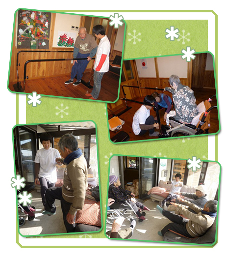 去年から機能訓練担当に理学療法士の資格を持つスタッフが白いうわっぱりに身を包んで登場してくれています。当然、利用者さん達は体と心を引き締めてパシッとします。時には全体で、時には個別で機能訓練。介護スタッフへのアドバイスもあり、分かりやすいので「なるほどなるほど…」とすんなりと習得できます。 介護もリハビリも看護も、職員同士それぞれが専門的知識や技術を持ち、それを生かす感性、そしてお互いを尊重しあえる連携を大切にすることを忘れずに毎日を送りたいと思います。